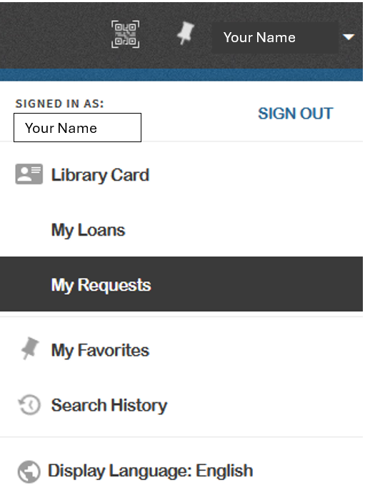 Log in to your library account and select My Requests from the drop-down menu in the upper right corner.